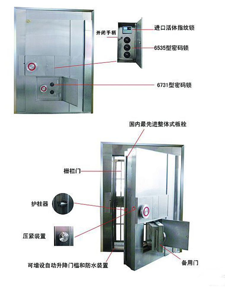 根据用户订货要求,金库门可增设附加装置:如报警器及报警信号传输装置进行异域地报警:安全重锁装置在破坏性开启时,能有效防止锁定机构运动,防止门被开启;可采用高性能微处理器的电子密码锁或指纹锁,操作简便、保密性强;另可配备应急小门,提供另一条紧急进入金库的通道。