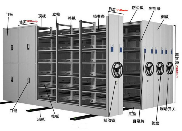 密集柜采用优质冷轧钢板模压成型,密集柜表面经除油、去锈、磷化等十道工序前处理。国际最新流行色亚光静电喷粉密集柜,是经高温塑化而成,防锈蚀性能卓越。 密集柜架体外观设计精美,线条流畅,使库房整洁美观,操作轻便灵活,运行平稳。密集柜采用组合装配式设计,搬迁和拆装均不受损。每列架体设有安全限位及防倾倒装置密集柜,以保障通道内人员安全。密集柜边架装有锁具,用于整体锁闭。 密集柜架体之间的接触面均有缓冲和磁密封胶条。顶部有防尘板,底部有防鼠装置。具有良好的防尘、防鼠、防潮和防火功能。 传动机构采用精密轴承,传动灵活平稳。层板层距根据需要可自由调整。